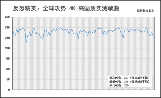 《反恐精英:全球攻势》是一款有 VALVE 与 Hidden Path Entertainment 合作开发的第一人称射击游戏,是《反恐精英》系列游戏的第四款作品,作为一款竞技向的 FPS 游戏,其对游戏帧数有着较严格的要求。在 4K 分辨率下开启高画质、多核渲染(CPU空余核心辅助渲染)设定,可以全程跑在 240FPS 以上,性能表现远超竞技级游戏标准。