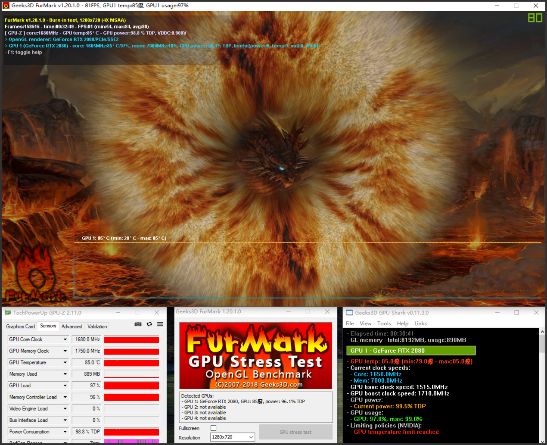 RTX 2080 用上了12nm工艺,并且首次采用了 GDDR6 显存(显存频率也提升至了14000MHz) ,带宽对4K渲染有更好的支持,功耗也有所降低。刃9000 3代这块 RTX 2080,GPU 核心频率默认为 1515MHz,可以动态提升至1710MHz。使用 FurMark 烤机 30分钟,测得 GPU 核心的平均温度和最高温度都在85℃。